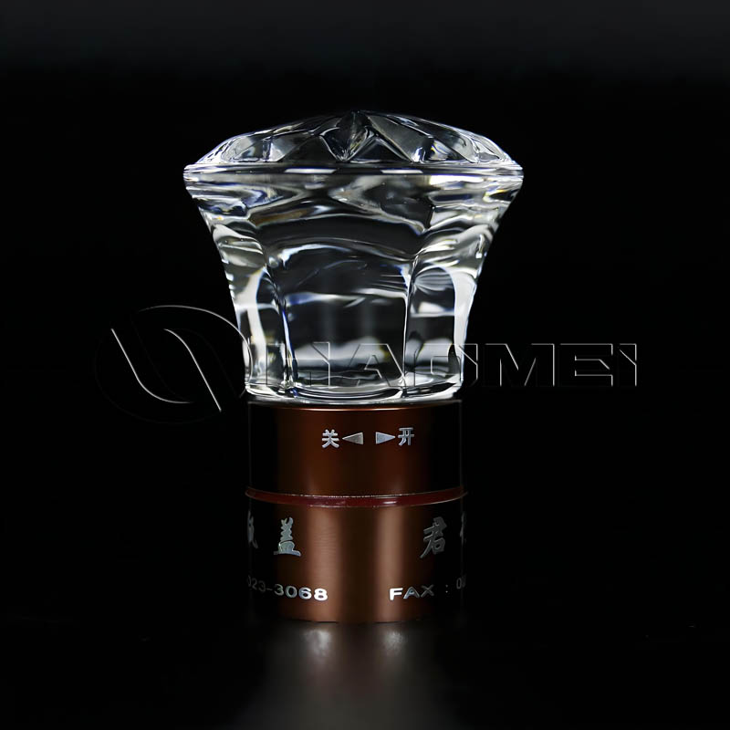 A combination of a transparent crystal head and a plastic base, commonly used for high-end packaging of perfume bottles, cosmetic bottles, liquor bottles, essential oil bottles, etc., enhancing product texture and visual appeal.